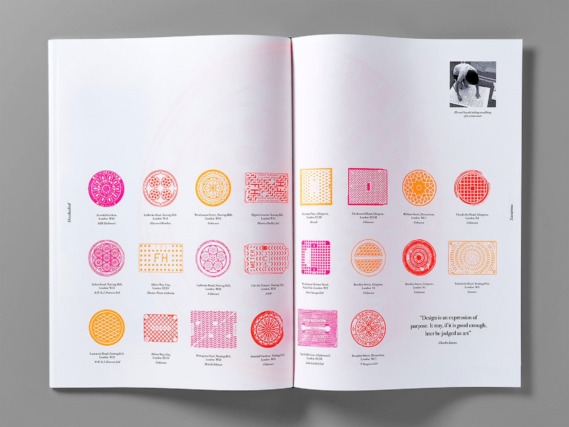 About those that protect vast cavernous tubes and clasp London’s electricity, water and gas. London streets are filled with them; and Marina Willer’s artfulness celebrates their unique patterns with her first Pentagram paper, called symptomatically Overlooked. The paper focuses on the gatekeepers to this world below our feet – overlooked street covers – with colourful imprints to represent these metal lids as flawless segments of industrial design, beautifully described as being “threaded throughout the functional fabric of a city”.