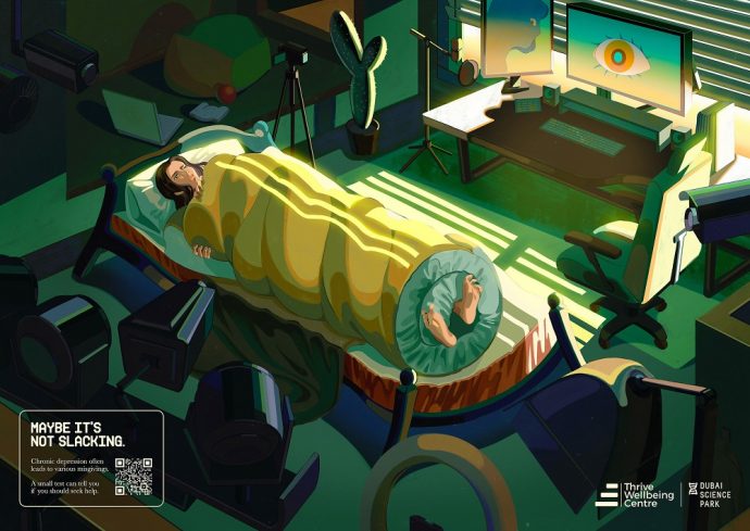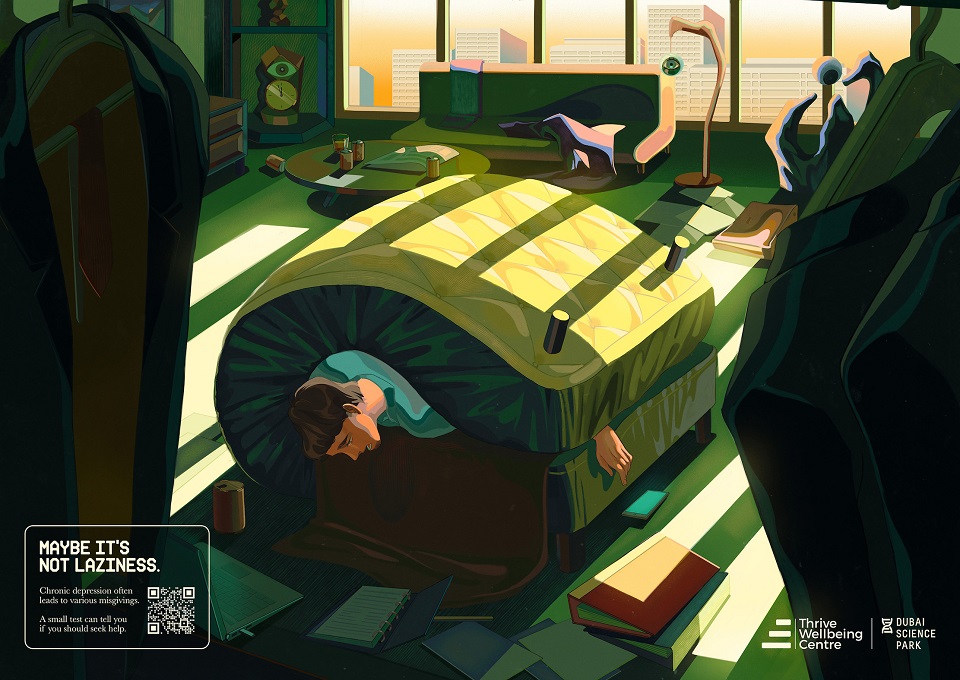 Knowing how to differentiate laziness from symptoms of depression is highly important, as this condition can negatively affect one’s quality of life. Sadly, in the Middle East, more than 66% of all cases go undiagnosed, mostly because of the stigmas associated with mental health issues. To raise awareness about this and encourage people to ask for help, Dubai Science Park teamed up with Thrive Wellbeing Centre to launch a new print/OOH campaign, aimed at making people understand that depression shouldn’t be mistaken for their flaws.